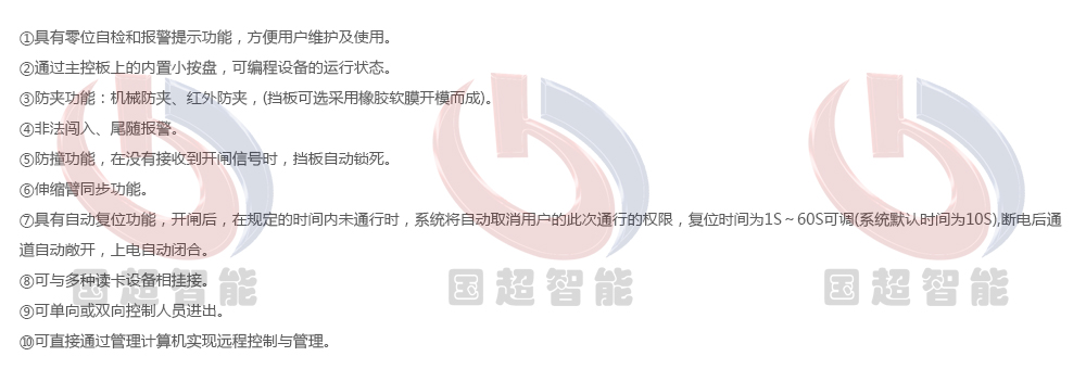 整個道閘外形采用SUS304不銹鋼板沖壓成型,智能翼閘能方便兼容IC卡、ID卡、條碼卡、指紋等讀卡識別設備的使用,為出入人員提供文明、有序的通行方式,有效管理人員進出。可廣泛應用于車站、碼頭、地鐵、工廠、大廈、智能小區、賓館、會所、企事業單位等需要對通道實現智能化管理的場合。分為:單機芯:用于單通道和多通道;雙機芯:用于多通道。