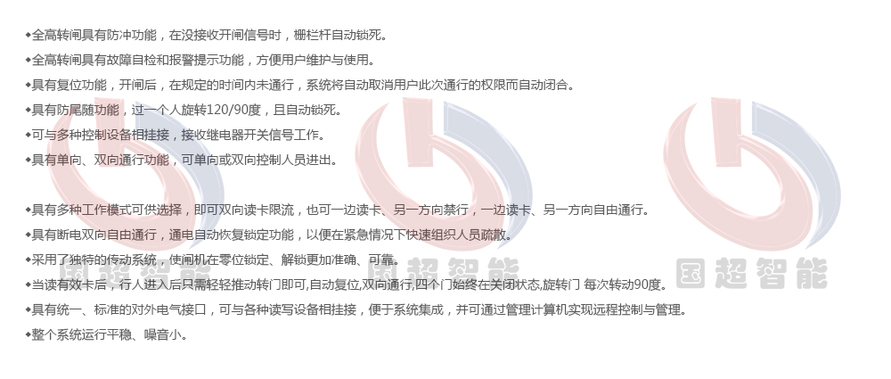應(yīng)用方案:感應(yīng)IC卡全高柵欄轉(zhuǎn)閘門管理系統(tǒng)、洗手機全高柵欄轉(zhuǎn)閘門管理系統(tǒng)、靜電測試儀全高柵欄轉(zhuǎn)閘門管理系統(tǒng)、身份證識別全高十字轉(zhuǎn)閘門管制系統(tǒng)