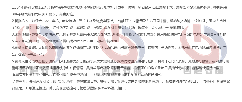 整個(gè)道閘外形采用SUS304不銹鋼板沖壓成型,智能擺閘能方便兼容IC卡、ID卡、條碼卡、指紋等讀卡識(shí)別設(shè)備的使用,為出入人員提供文明、有序的通行方式,有效管理人員進(jìn)出。對通道實(shí)現(xiàn)智能化管理的場合。分為:單機(jī)芯:用于單通道和多通道;雙機(jī)芯:用于多通道。